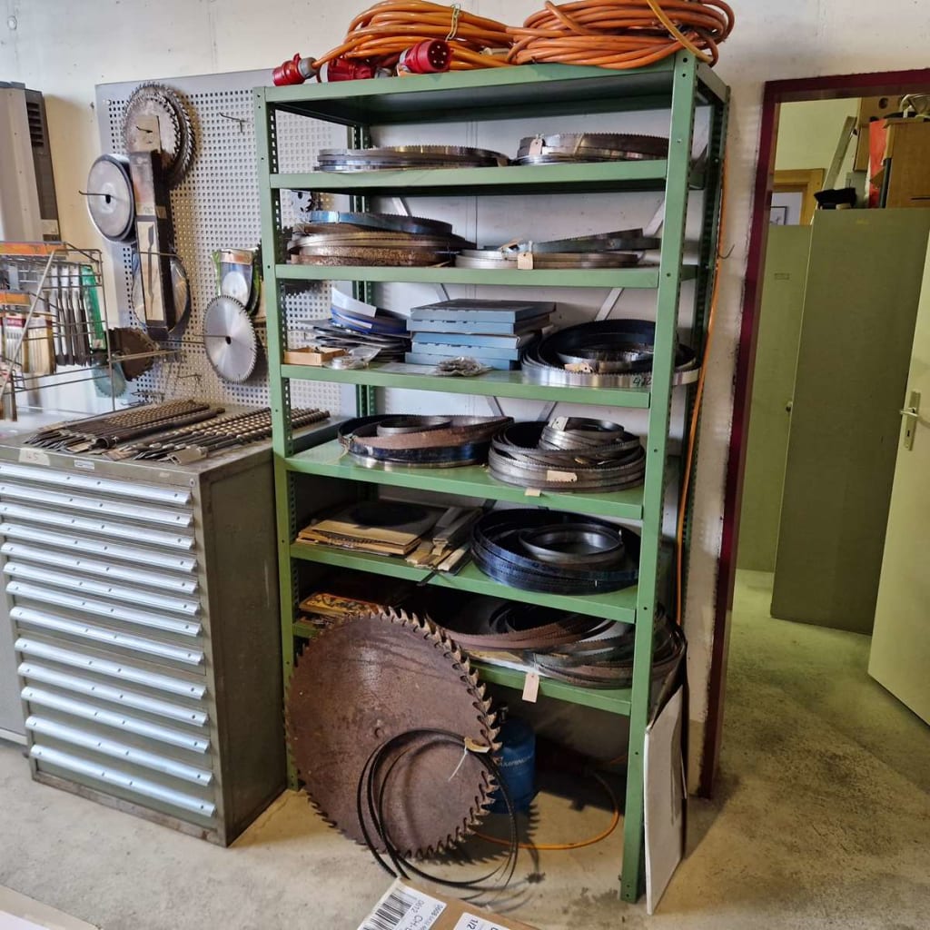 - ViewGreen metal shelf with 7 shelvesWeight 200kg - 1070x500x2000 mm - Contains various saw blades - Loading costs: €50.00 - Location: Route de l'Industrie 11, 1772 GROLLEY - SWITZERLAND