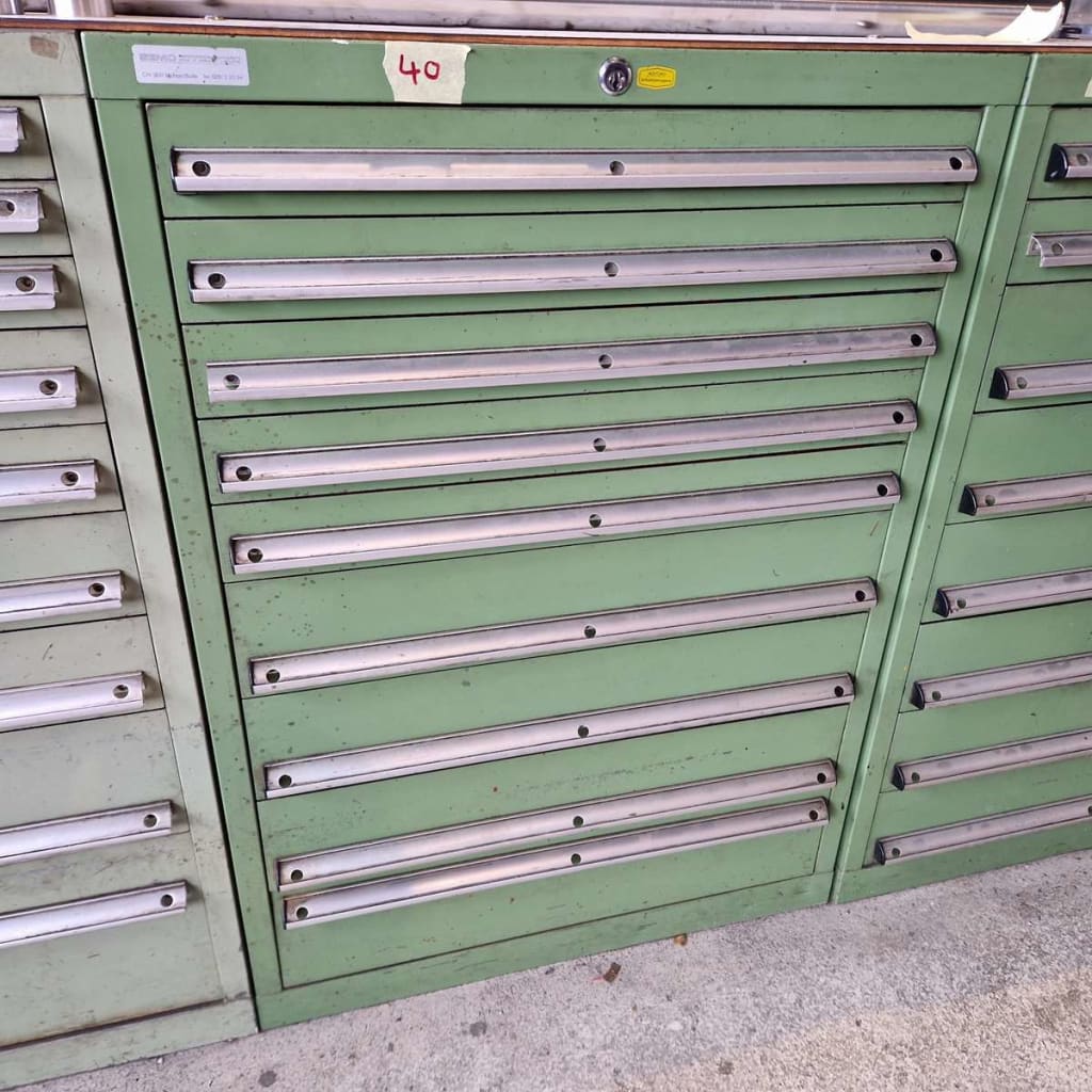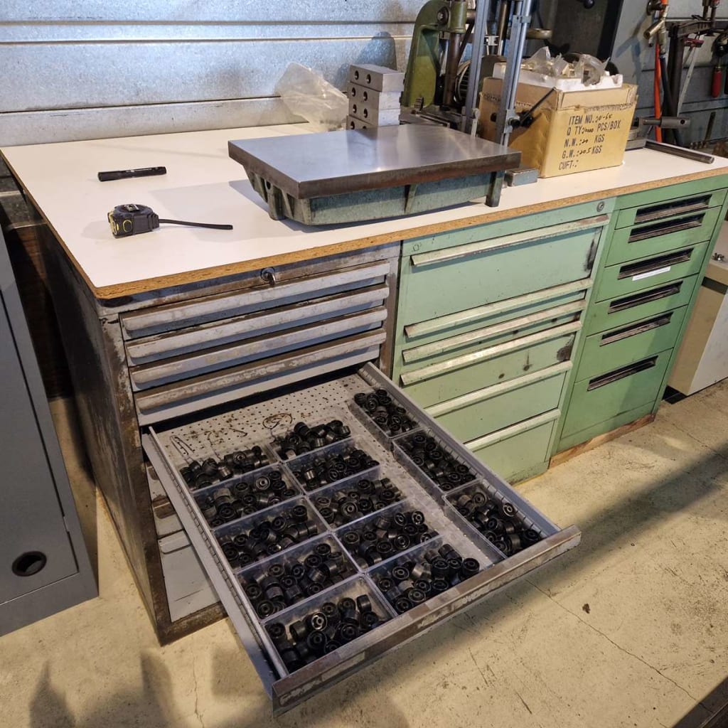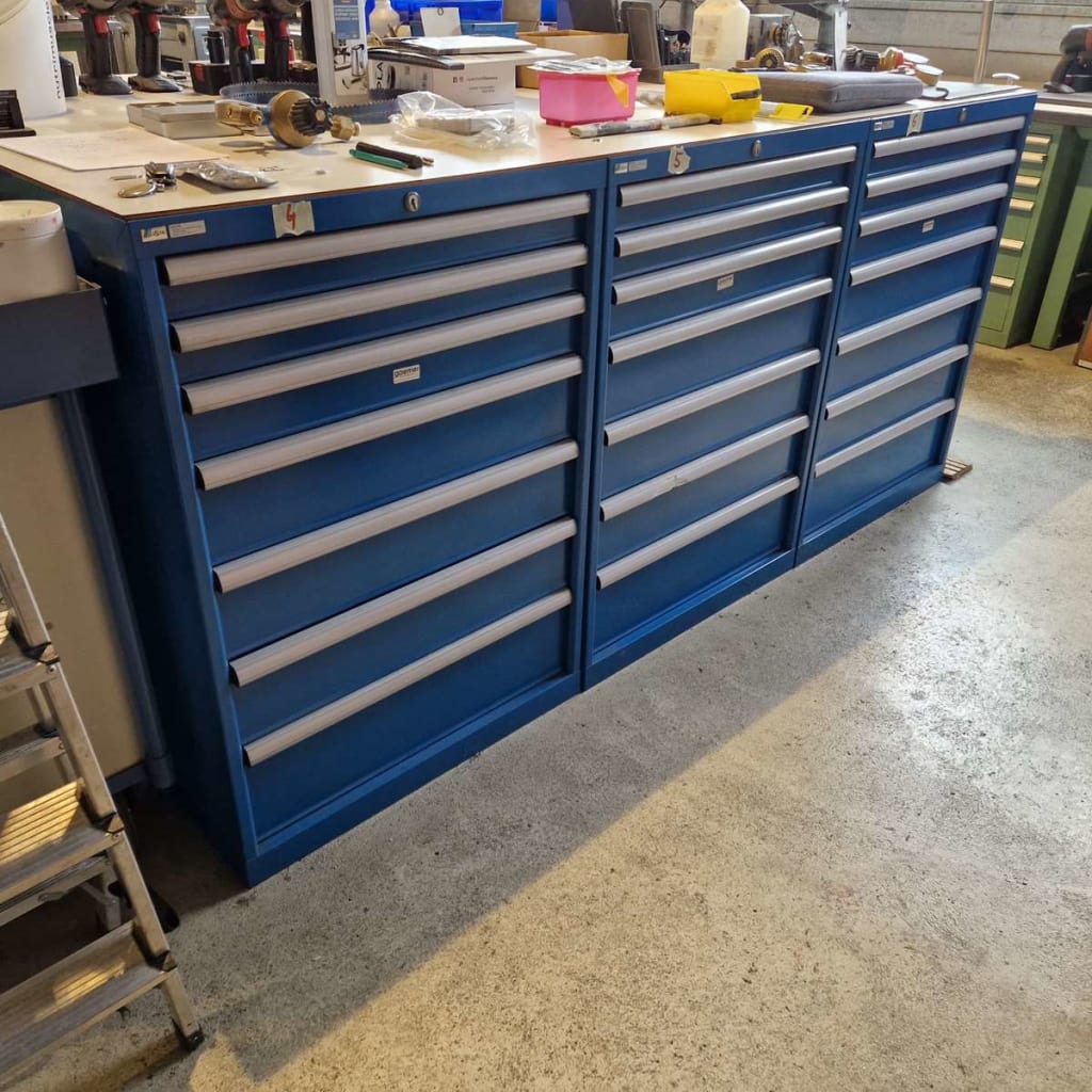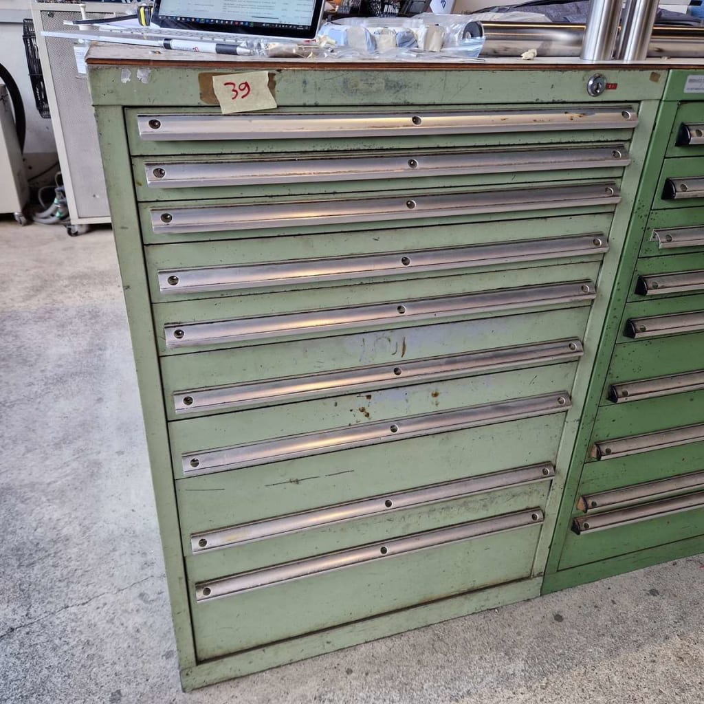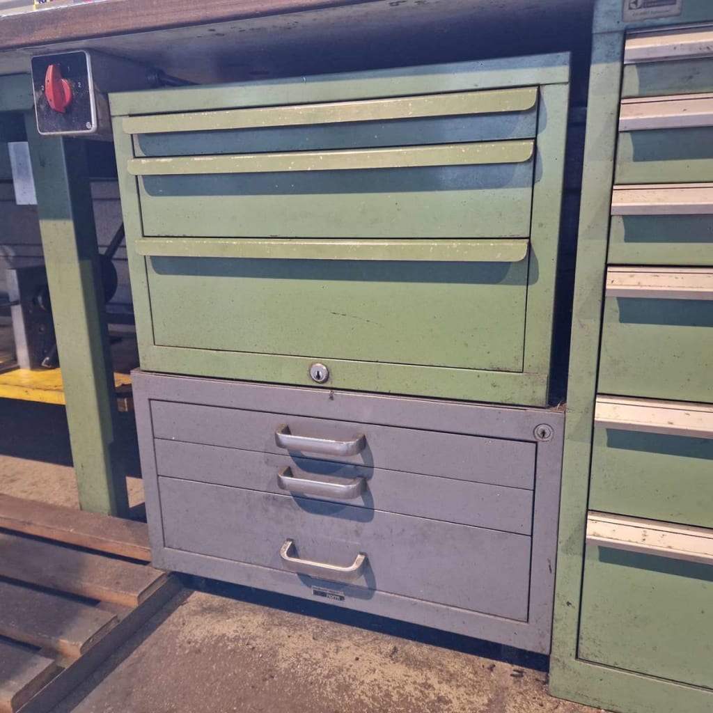 - ViewWorkbench with 3 cabinetsWeight 300kg - 7680x880x870 mm - 1 8-drawer chest and 2 6-drawer chests - All drawers are empty except for two - Loading fee: €50.00 - Location: Route de l'Industrie 11, 1772 GROLLEY - SWITZERLAND