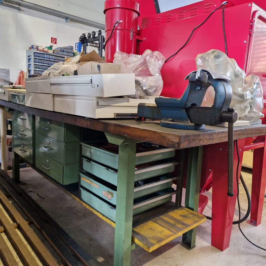 - ViewWorkbench with 4-drawer cabinet + viceWeight 300kg - 2000x830x850 mm - Without tools on the tray - Loading costs: €50.00 - Location: Route de l'Industrie 11, 1772 GROLLEY - SWITZERLAND